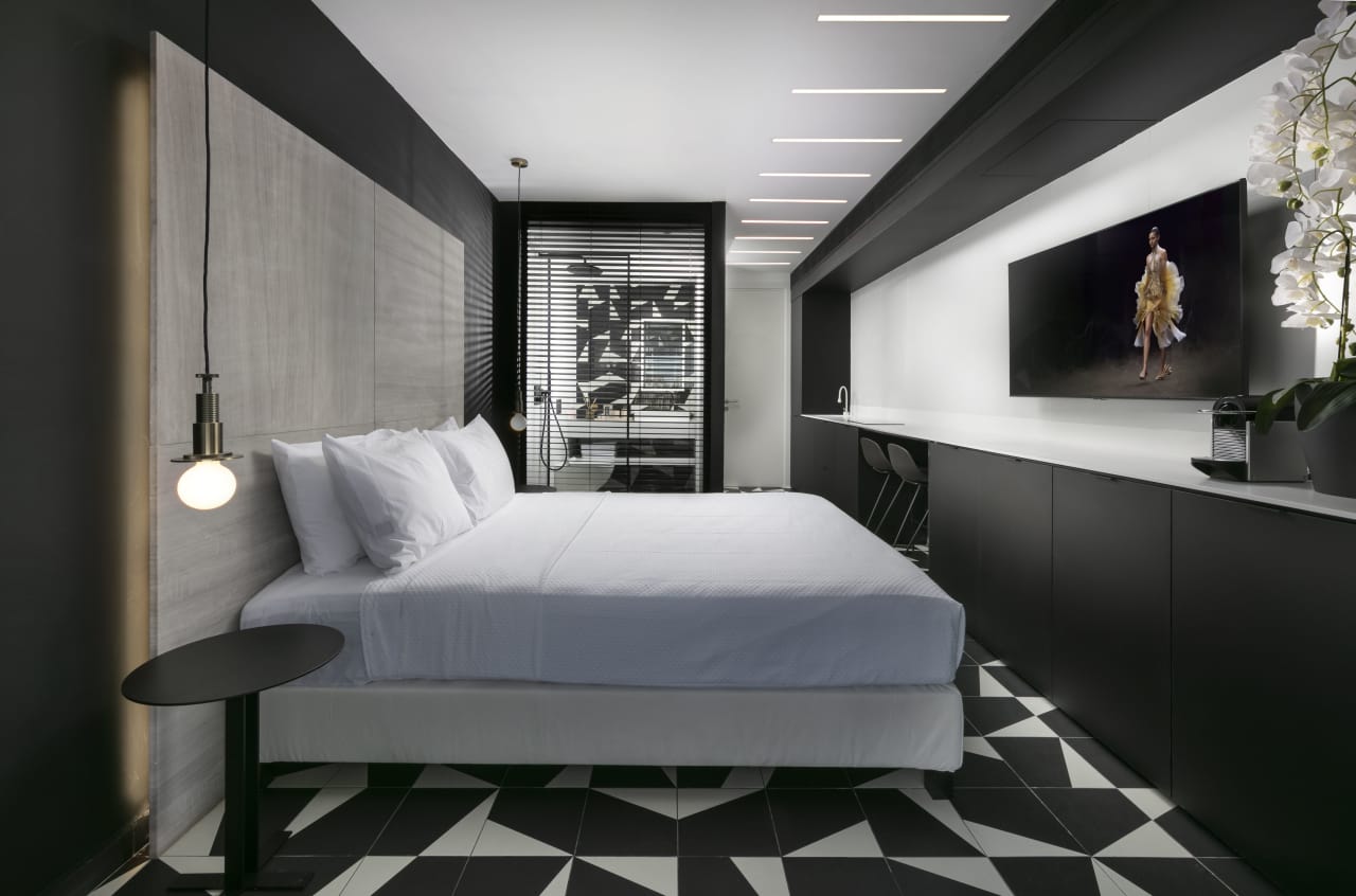 The Seventh Floor of Bezalel Seven. Jerusalem insiders will recognize this address as a prime location in the City of Gold. Allow yourself to be swept up to our magnificent artistically curated suite, with exquisite design and modern luxury amenities in each room. The suite comprises three connected but independent studios, each named after one of Israel’s greatest painters and decorated with his prints. Each has its own furnished balcony with stunning panoramic views. Prepare to be astounded.