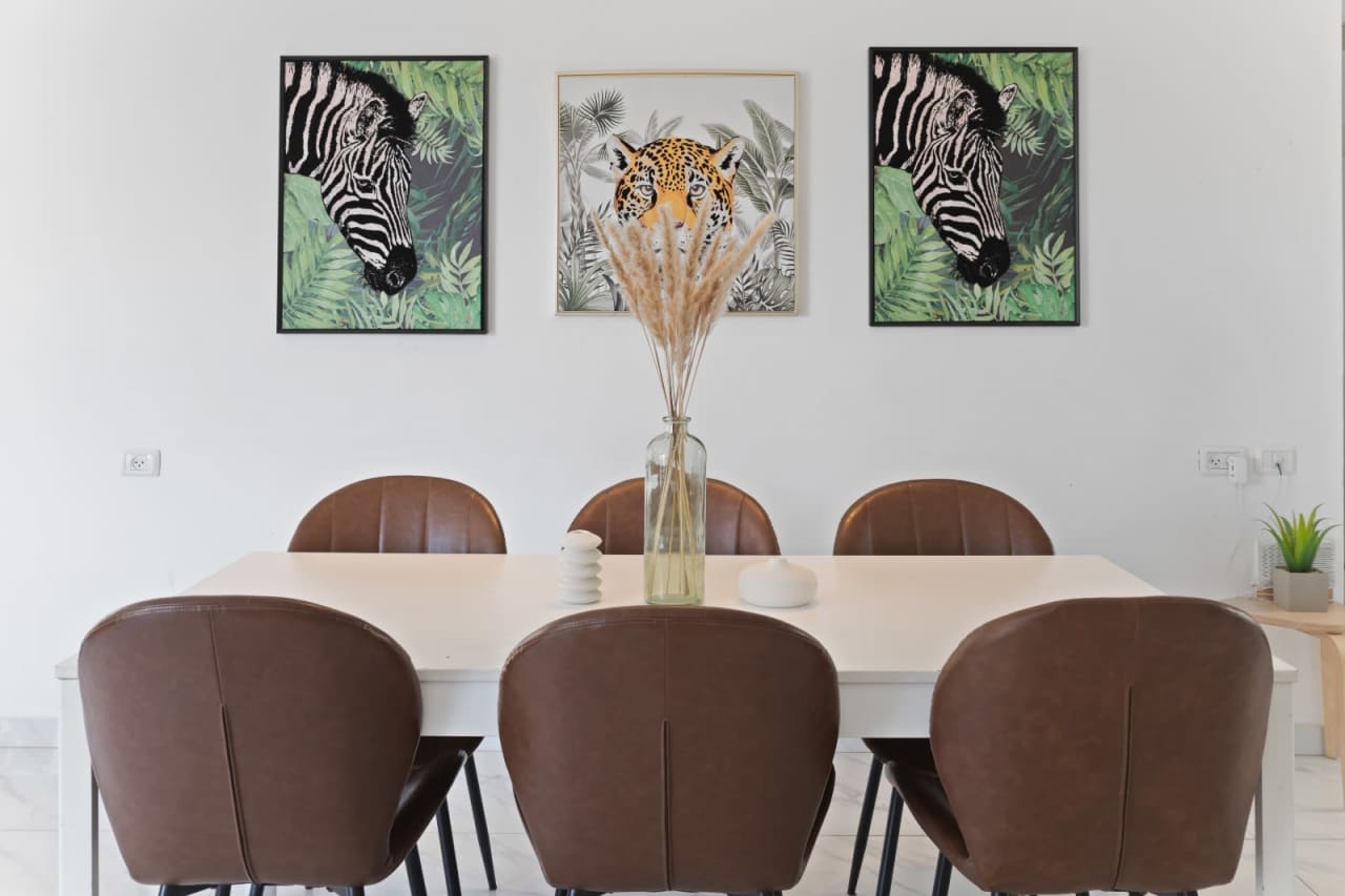 A classy dining table seats eight comfortably. A comfy couch faces a wall-mounted flat-screen smart TV with multi-channel, multi-language entertainment. Or just gaze out the large windows at the red rooves of the city far below, or the calming green of Sacher park, the largest in Jerusalem, just steps away. Relax and enjoy!