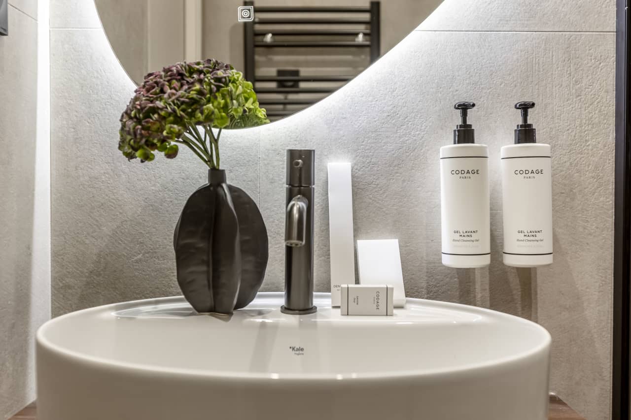 The Top Floor Double Room is distinguished by its unique Parisian under-roof design. While the hotel has an elevator, reaching this room requires ascending one additional flight of stairs. Inviting beds ensure a restful night’s sleep, while the stylishly curated colour palette surrounds you with the timeless elegance of Parisian chic.